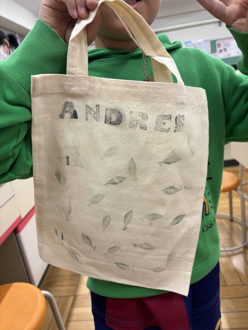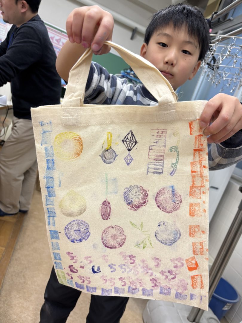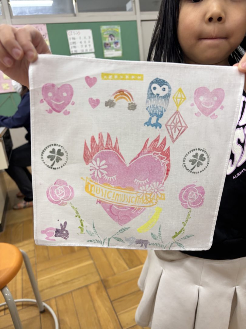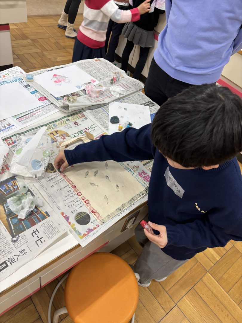 慎重に練習してから臨む子もいれば、大胆に押していくお友だちもいます。バッグは両面押せるので押し甲斐があります。みんな工夫してユニークなものから繊細な色合いのもの、唯一無二のハンカチ、バッグを作っていました😊