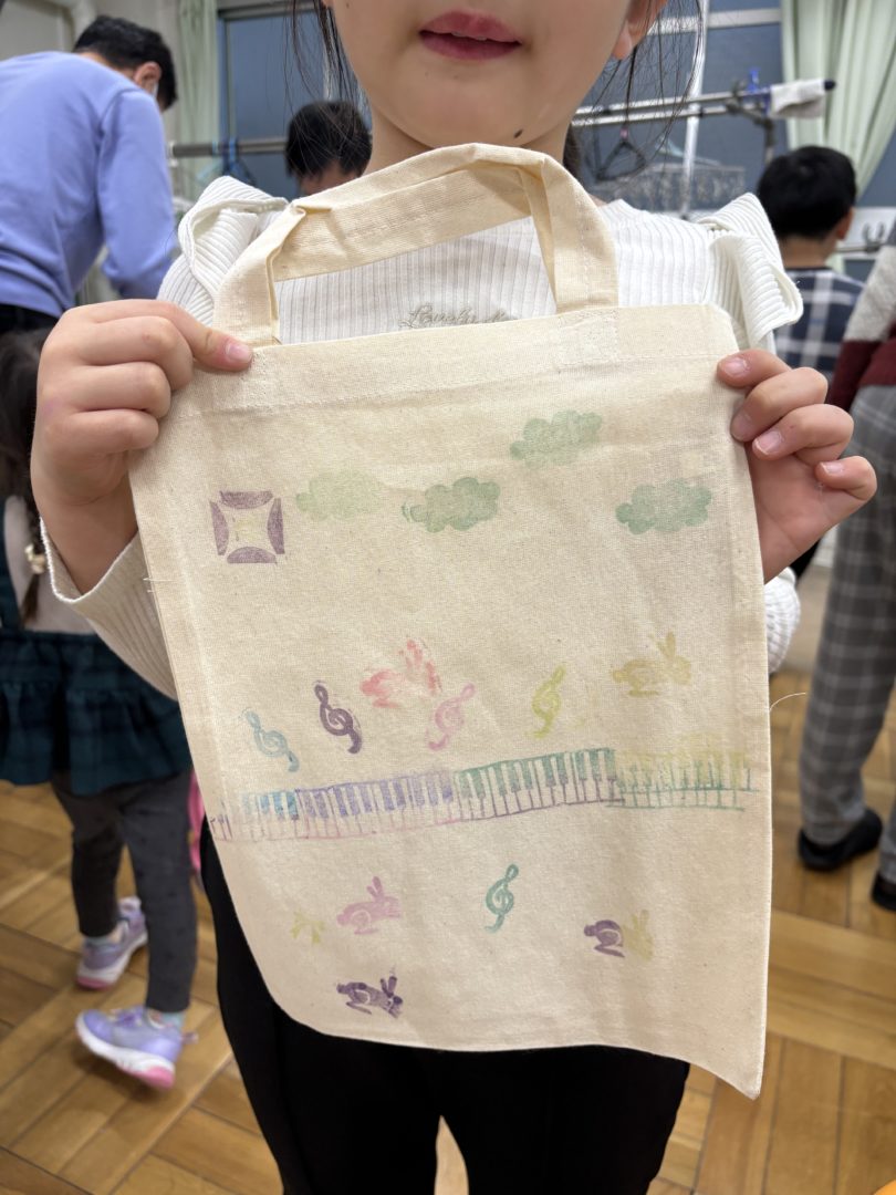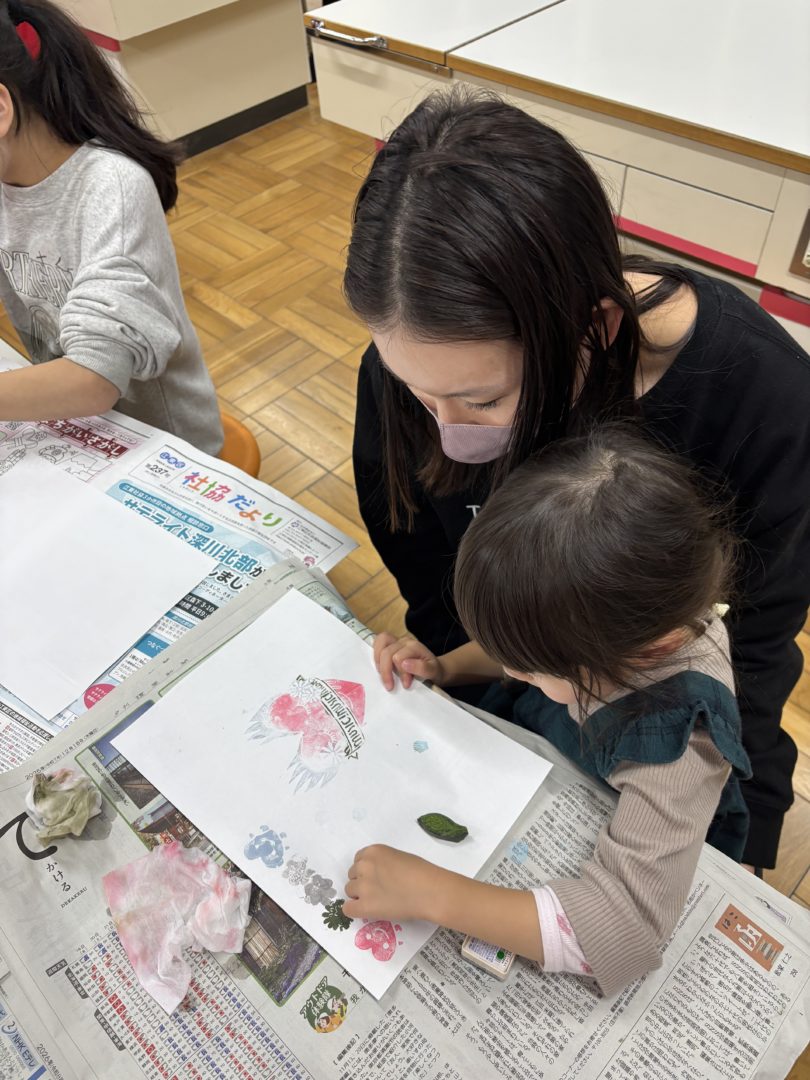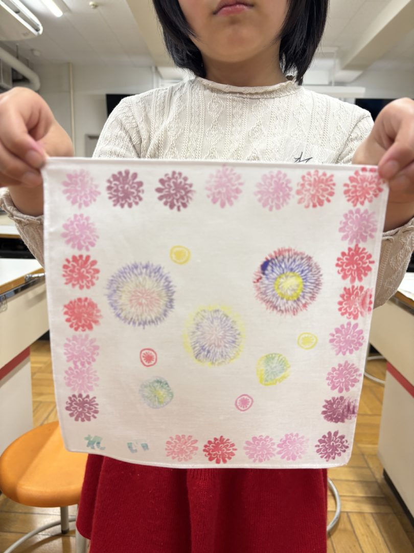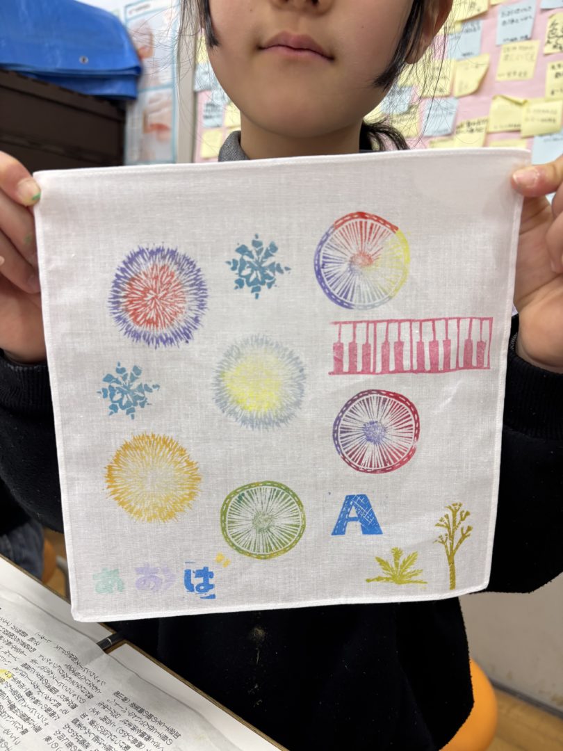 慎重に練習してから臨む子もいれば、大胆に押していくお友だちもいます。バッグは両面押せるので押し甲斐があります。みんな工夫してユニークなものから繊細な色合いのもの、唯一無二のハンカチ、バッグを作っていました😊