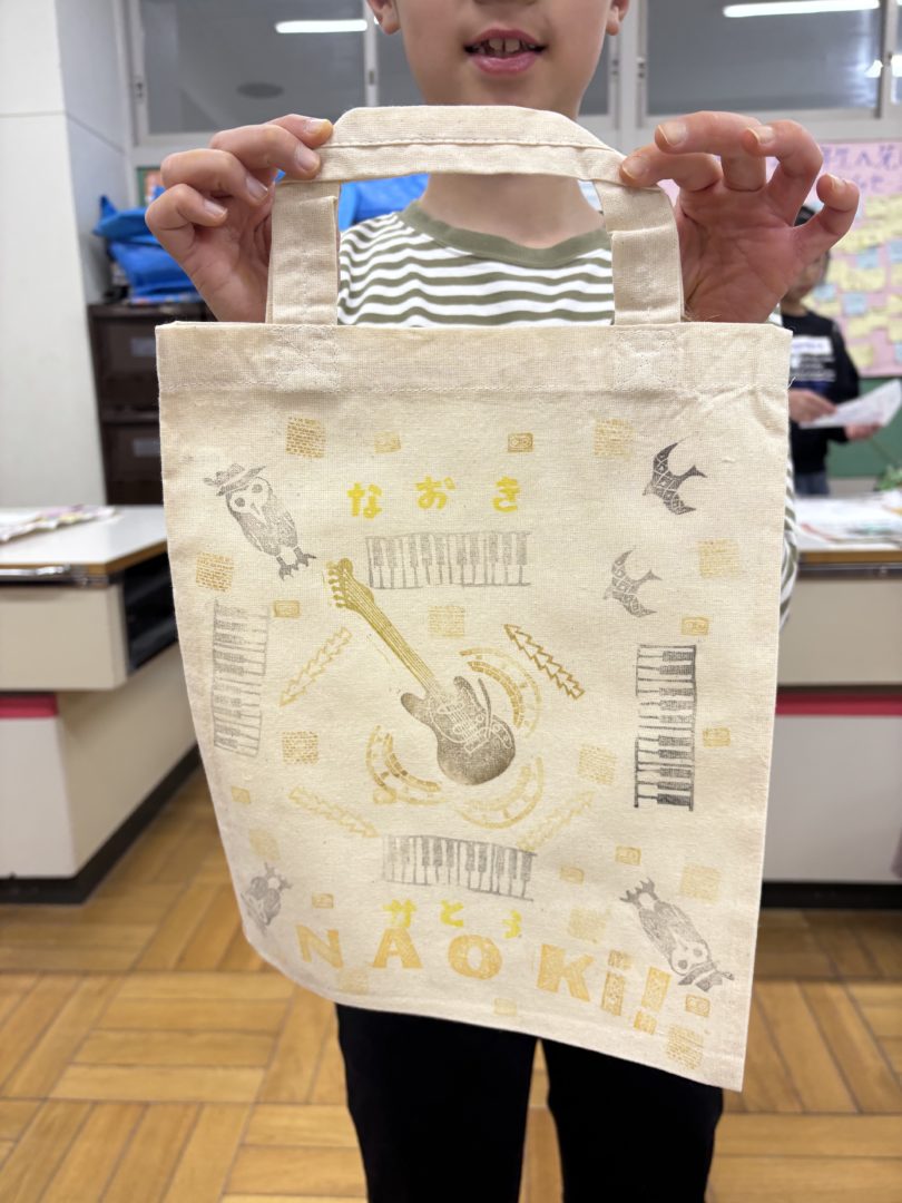 今回はPTAの方が特別に素材のバッグを提供してくださったので、ハンカチと選べてラッキー。それぞれ、押したいものを選んで制作していきました。