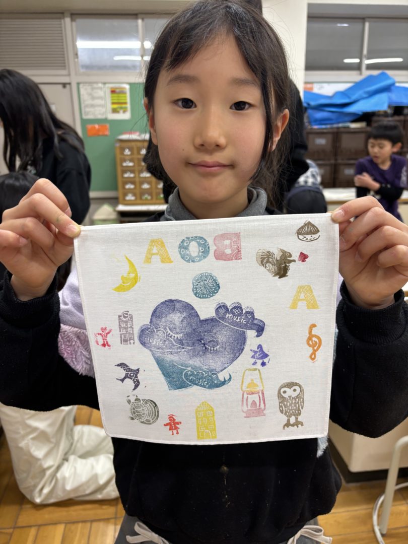 今日1/17(土)は深川小学校のウィークエンドスクールの消しゴムはんこでミニハンカチとバッグを作る日でした。第一部と二部に分けて、総勢40名くらいのお友だちが参加してくれました。